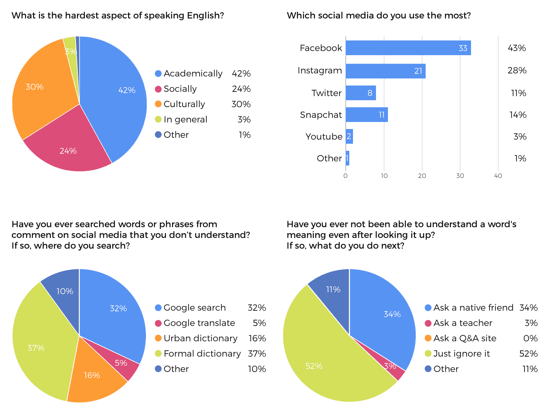I found out a lot of useful information from this survey. It was surprising that many of students feel like they are struggling with communicating in English in terms of social and cultural aspects. It was nothing to do with their English skill levels. Also, I interviewed several students who participated in the survey and asked them about learning English through social media. Some of them actually consider social media as an educational resource and the others don't care that much. However, it was impressive how many people rely on Urban dictionary when it comes to searching casual phrases. A lot of my initial assumptions were reassured and I also discovered new ideas and was able to narrow down the target users.